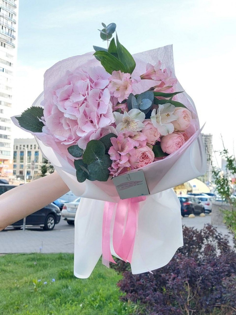 Букет с альстромерией, гортензией, розами и эвкалиптом