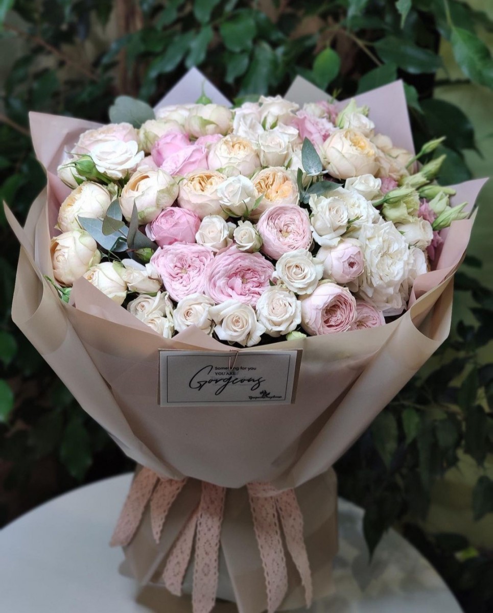 Букет с садовыми пионовидными и кустовыми розами, эвкалиптом
