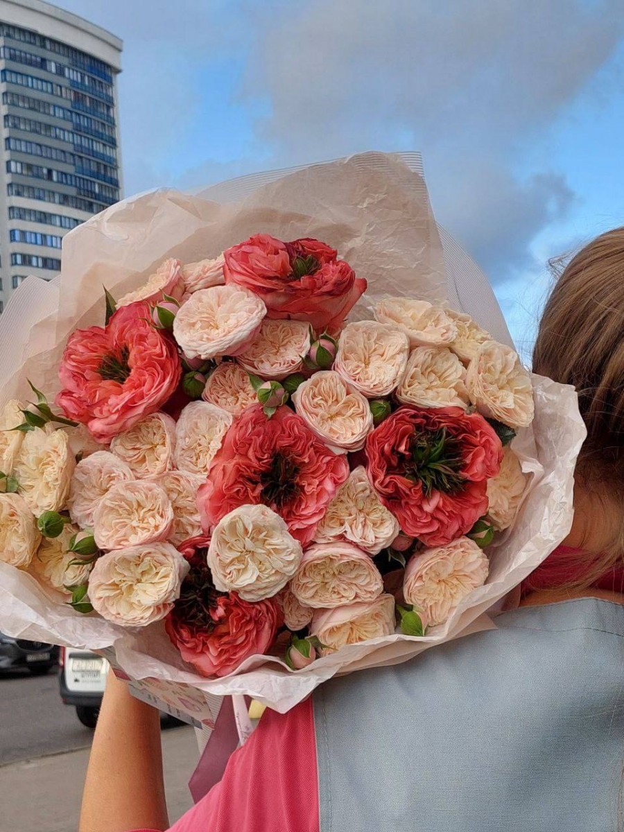 Букет из пионовидных роз Мандарин и Роял Блаш