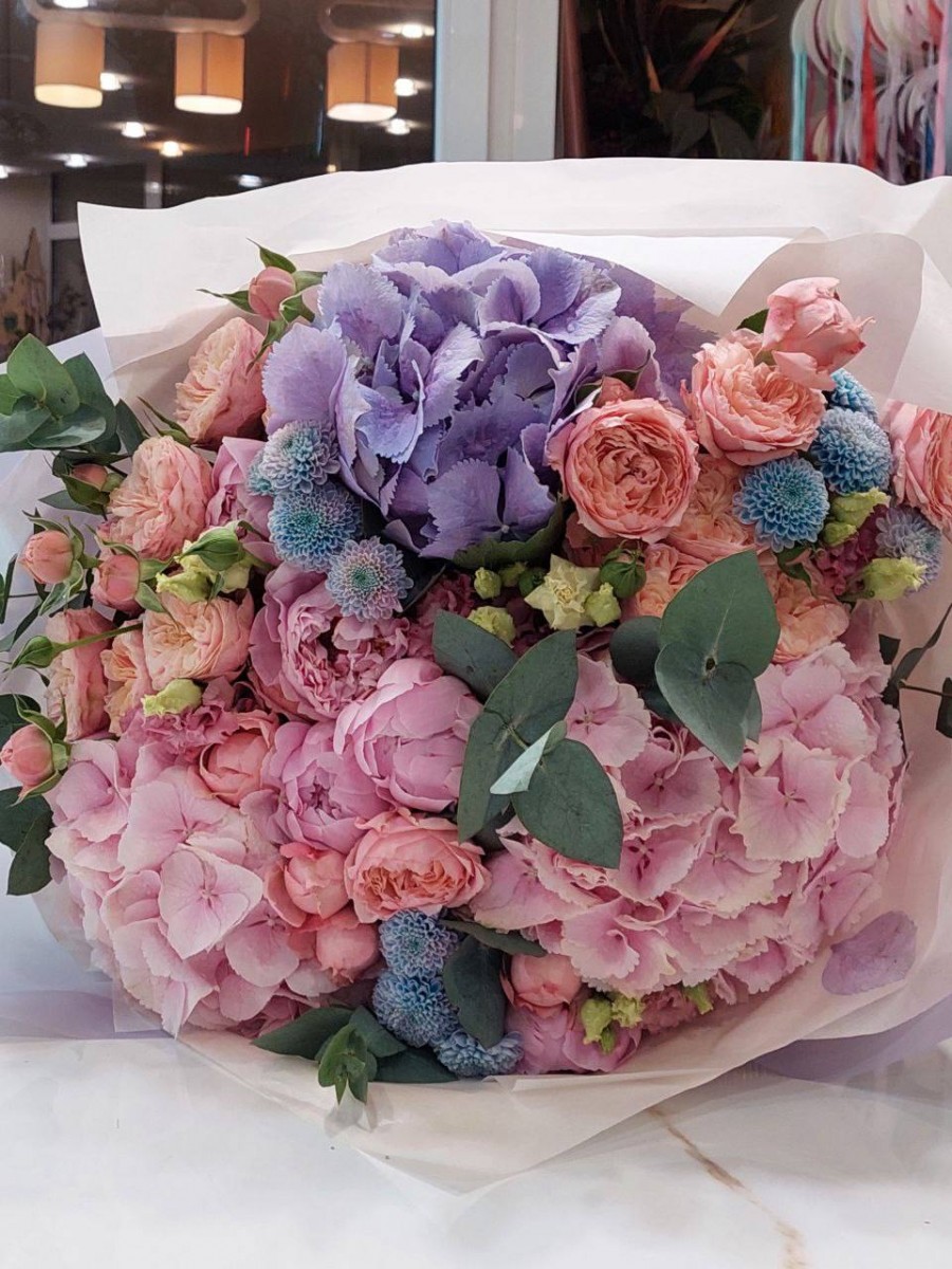 Букет с гортензией, пионовидных и кустовых роз, хризантем, пионов