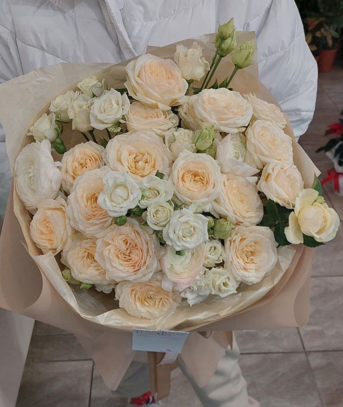 Букет с ранункулюсами, пионовидными розами Изабель, кустовыми розами и эустомой