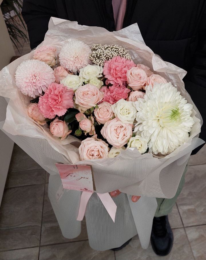 Букет с розами разных сортов, гвоздиками, хризантемами, озотамнусом