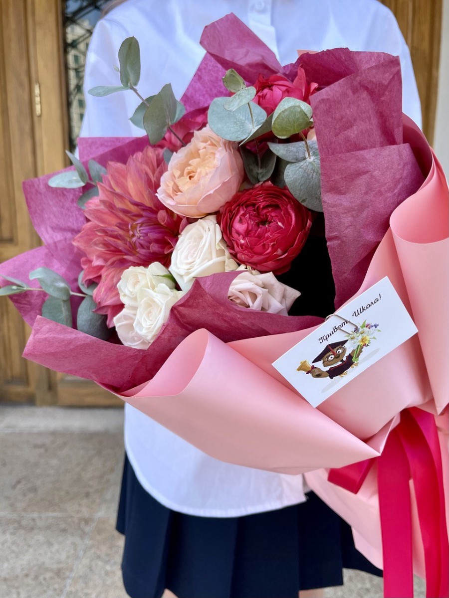 Букет с георгином, пионовидными кустовыми розами и эвкалиптом