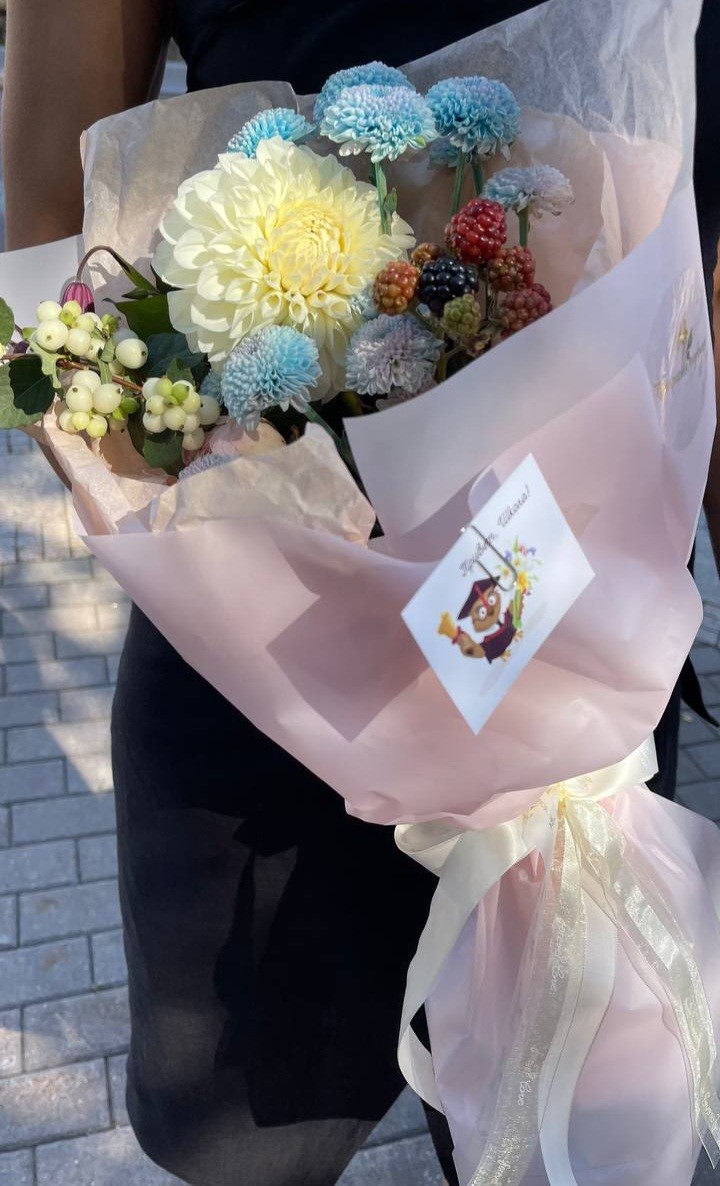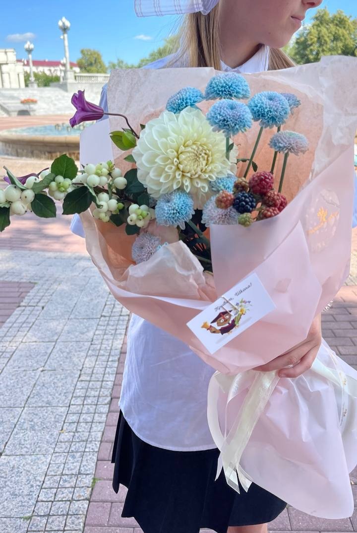 Букет в школу с георгинами, хризантемами, малиной