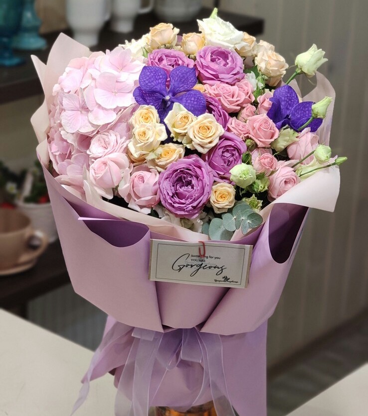 Букет микса из роз различных сортов с добавлением гортензии и ванды