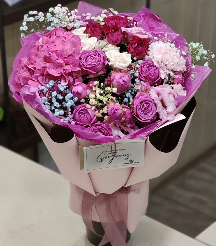 Букет с гортензией, кустовой розой Мисти бабблс, гвоздикой Мисти пинк и гипсофилой