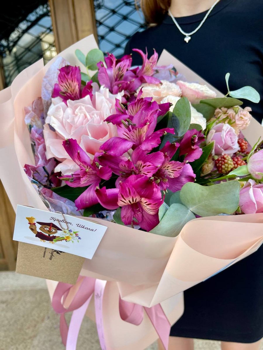 Букет из альстромерии, французских роз и кустовых роз и малины