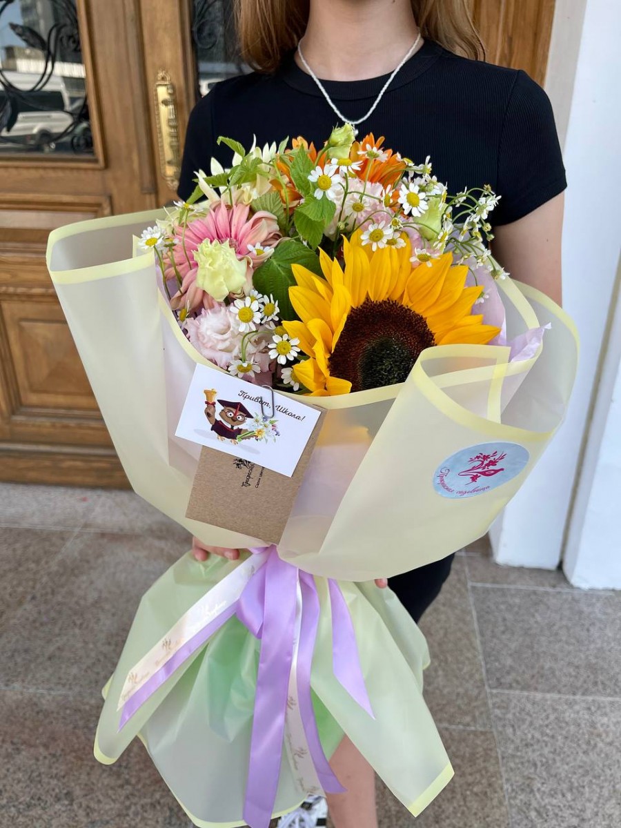 Букет с подсолнухом, герберами, эустомой, малиной и ромашками