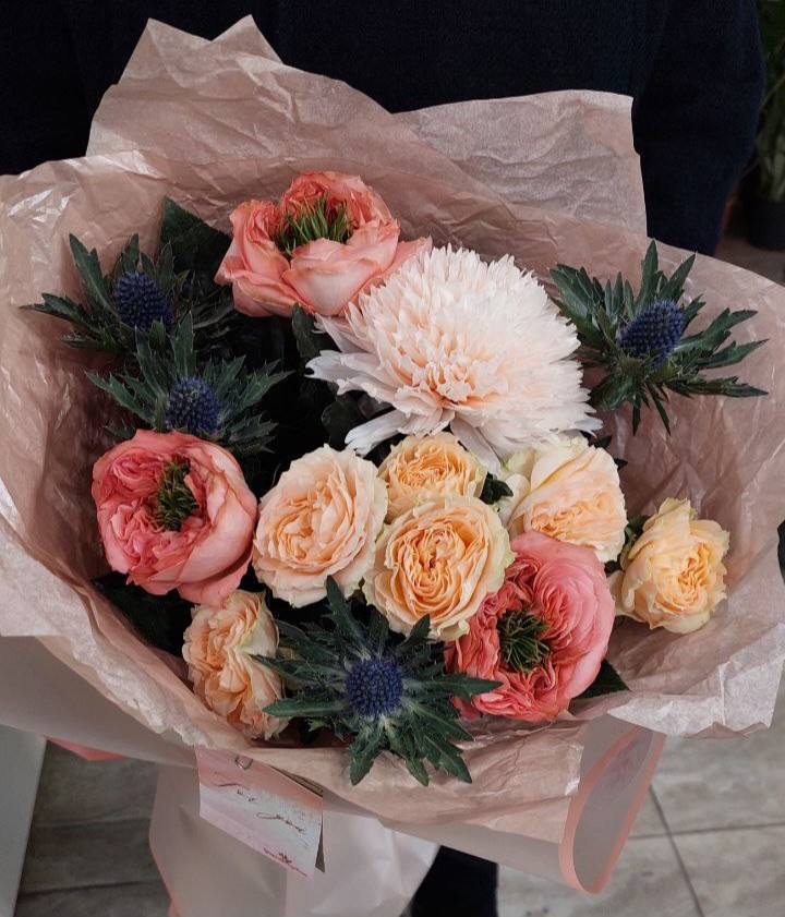 Букет с розами Мандарин, ирингиумом, хризантемами, пионовидными розами