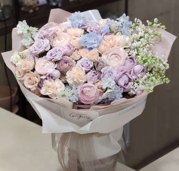 Букет акварельный с садовыми розами, дельфиниумом и сиренью