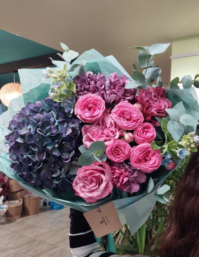 Букет (гортензия, гвоздика Гипноз, роза кустовая Жизель, Кантри Блюз, твидия, эвкалипт