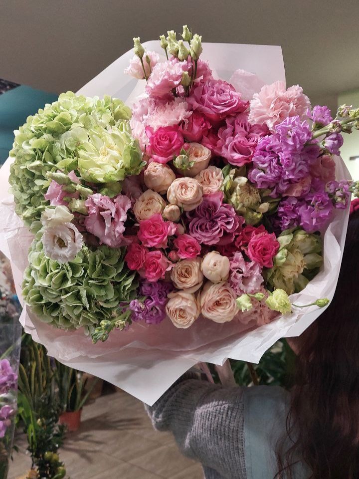 Букет (гортензия, роза кустовая Бритни, эустома Алиса, гвоздика, розы Вегги и Кантри Блюз, маттиола.