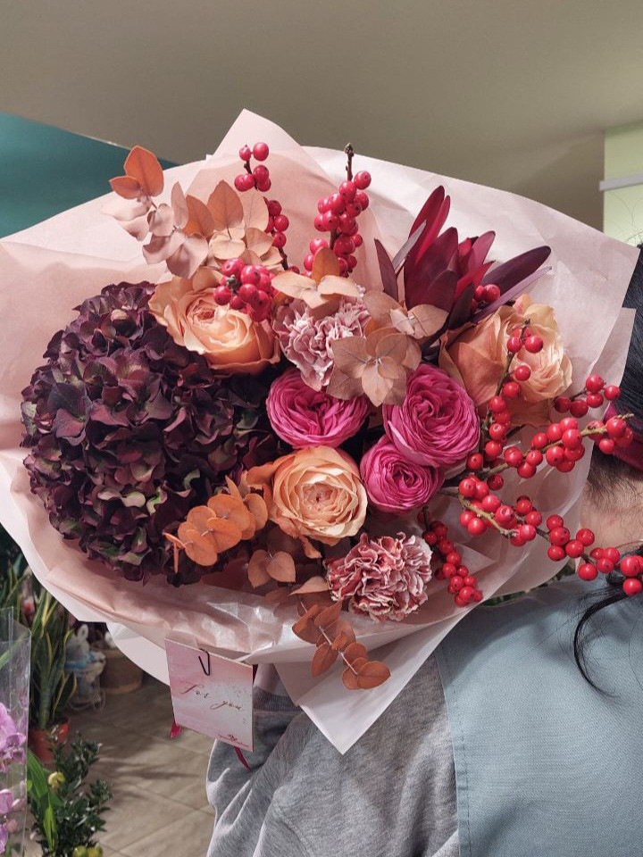 Букет (гортензия, розы Жизель, Кахала, илекс, леукодендрон, гвоздика, эвкалипт)