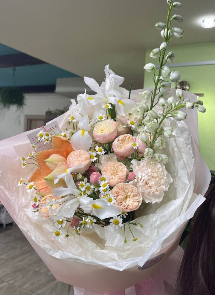 Букет из амариллиса, роз Роял блаш, танацетума, дельфиниума и ирисов