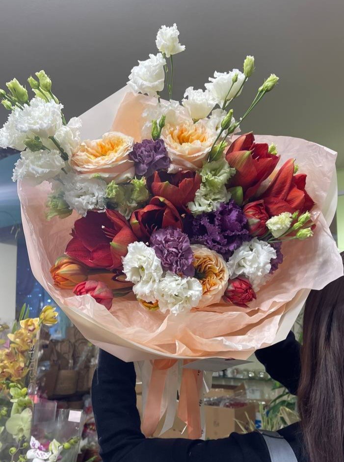 Букет из амариллисов, тюльпанов, роз Мелон экспрешн, эустомы, брассики