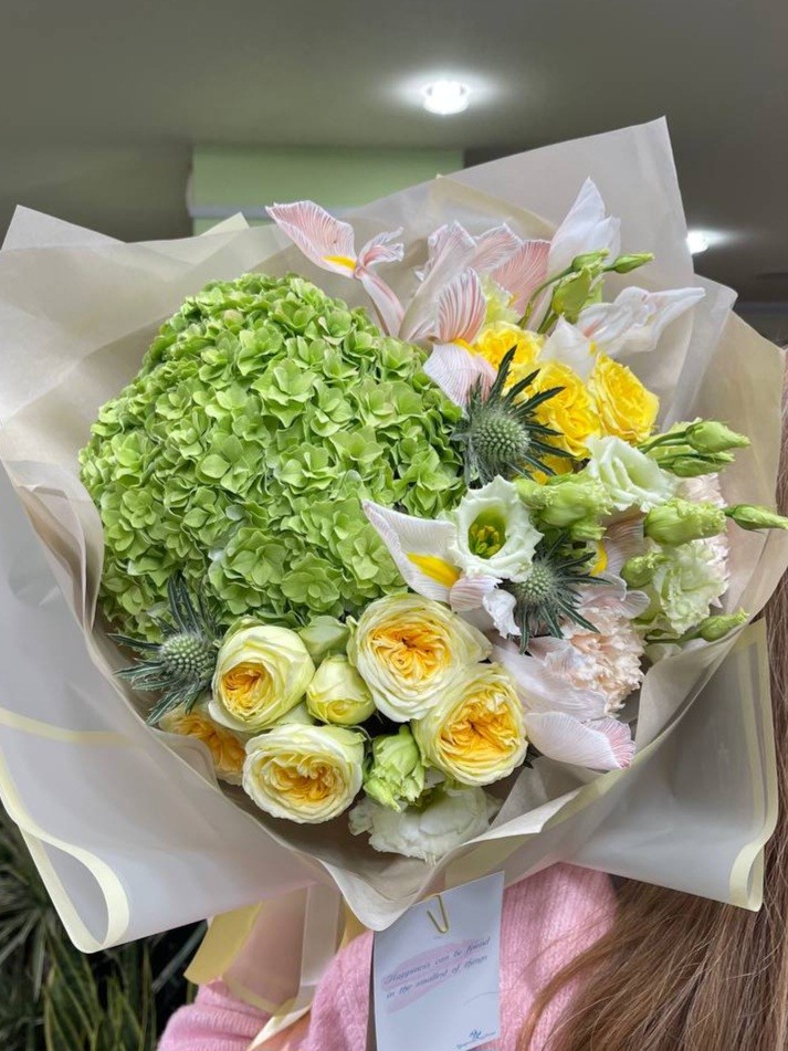 Букет из гортензии, эустомы Алиса, ирисов Брауни, эрингиума, пионовидной розы