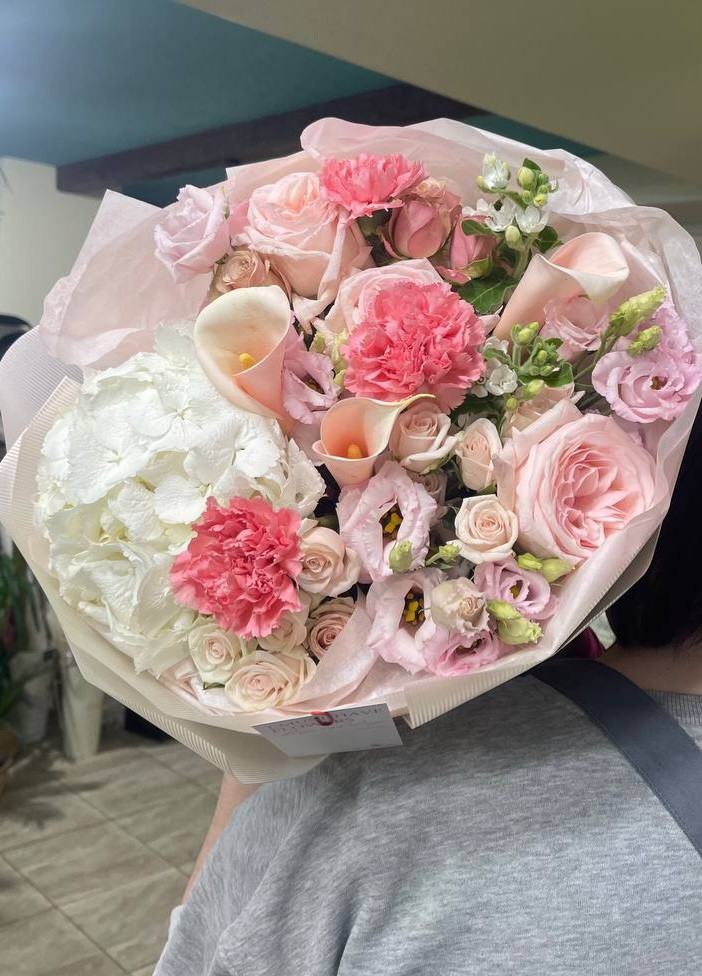 Букет из гортензии, калл, роз разных сортов, эустомы и твидии