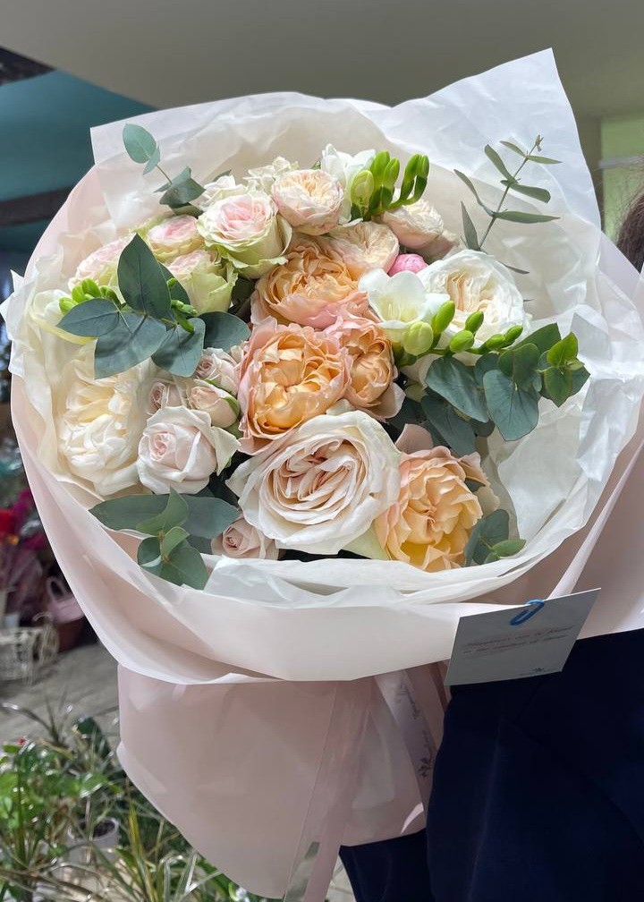 Букет из кустовой и одноголовой пионовидной розы, фрезии и эвкалипта