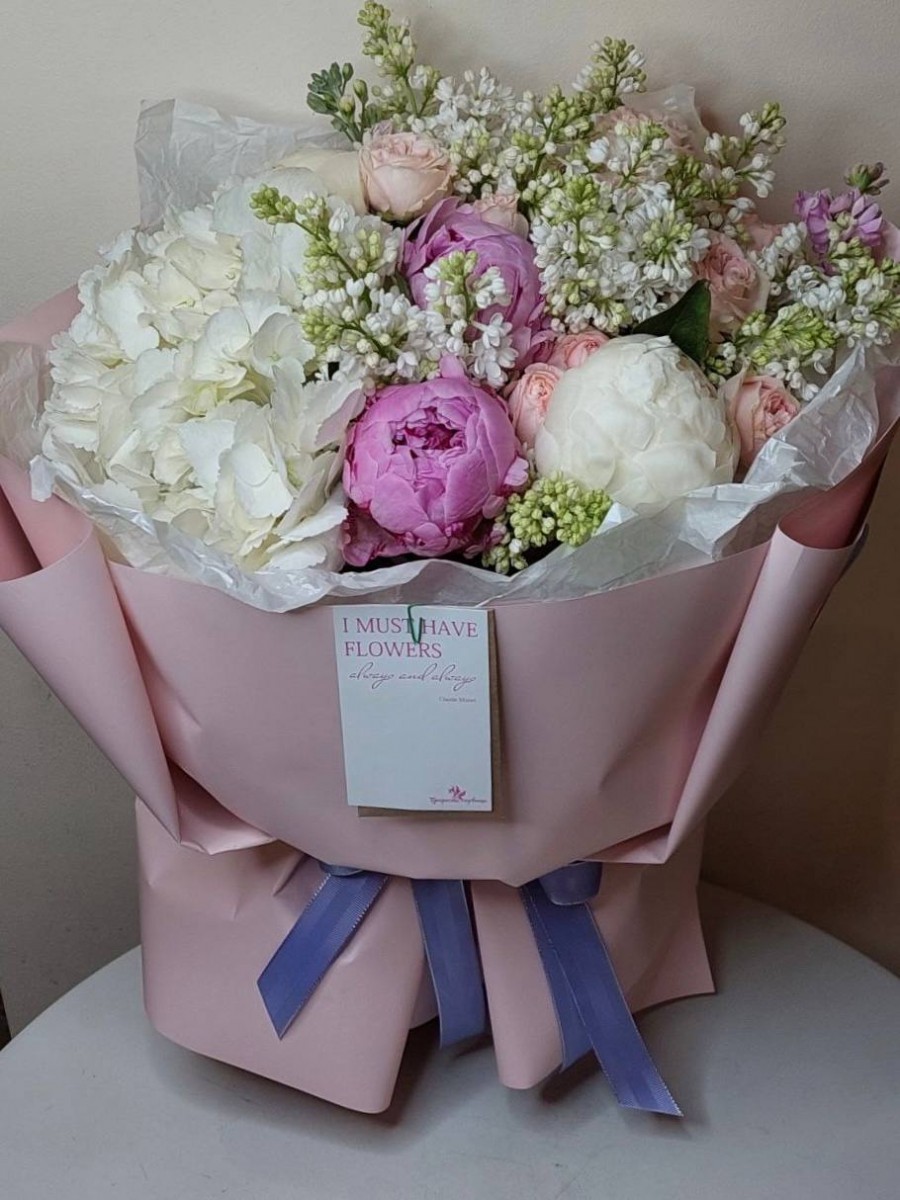 Букет из пионов, гортензии, сирени и роз