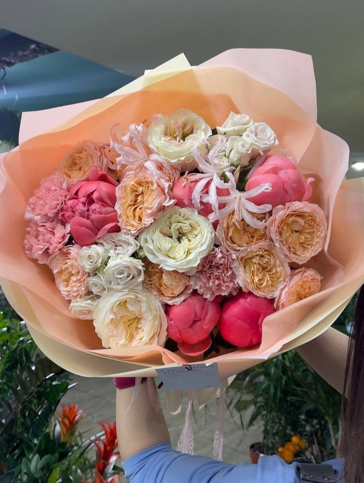 Букет из пионов Коралл Шарм, кустовой пионовидной розы, нерине и диантусов