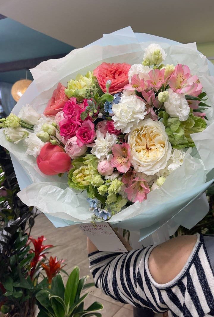 Букет из пионов Коралл Шарм, розы Вегги, Вики Гарденс и Кенди эксрешн, твидии, эустомы и альстромерии