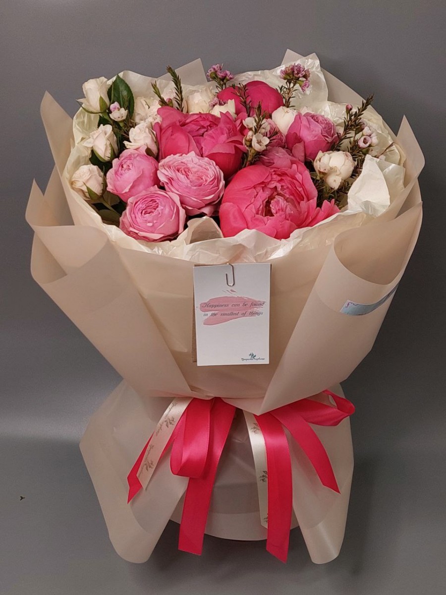 Букет из пионов, пионовидных роз и хамелациума