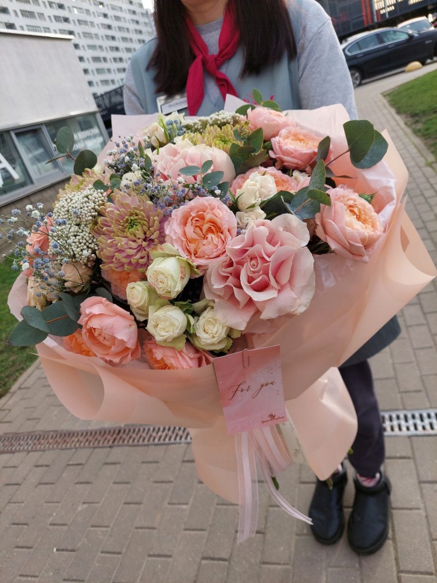 Букет из пионовидных роз, хризантем, гипсофилы, озотамнуса, эвкалипта