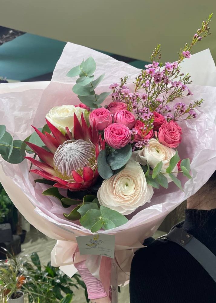 Букет из протеи, ранункулюсов, роз и хамелациума