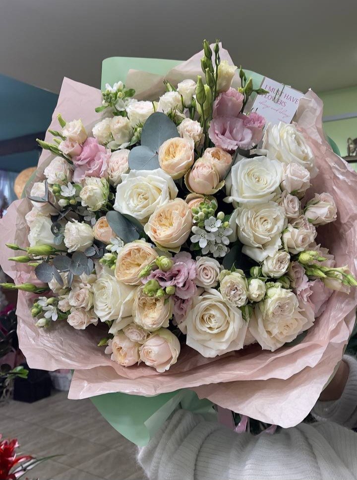 Букет из роз разных сортов, твидии, эустомы и эвкалипта