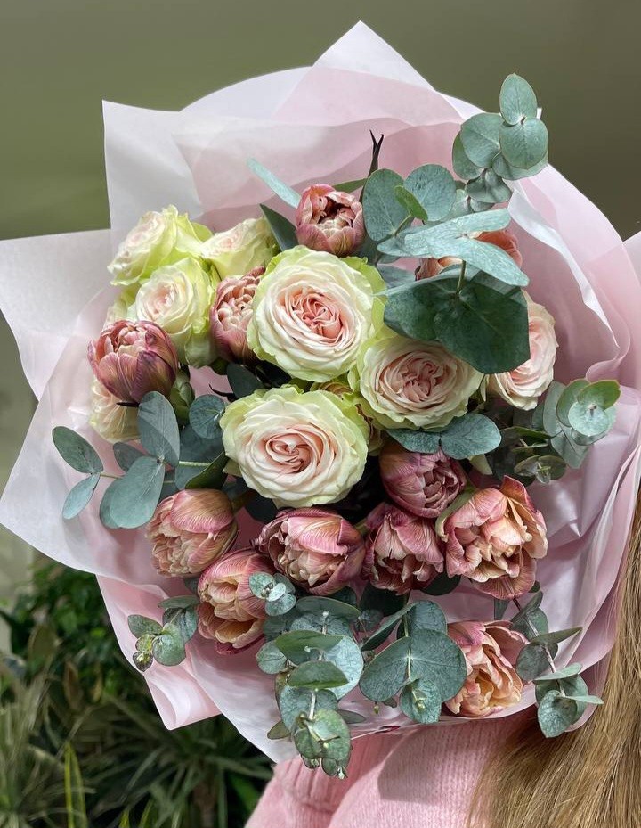 Букет из тюльпанов Брауни, роз Фибоначчи янтра и эвкалипта