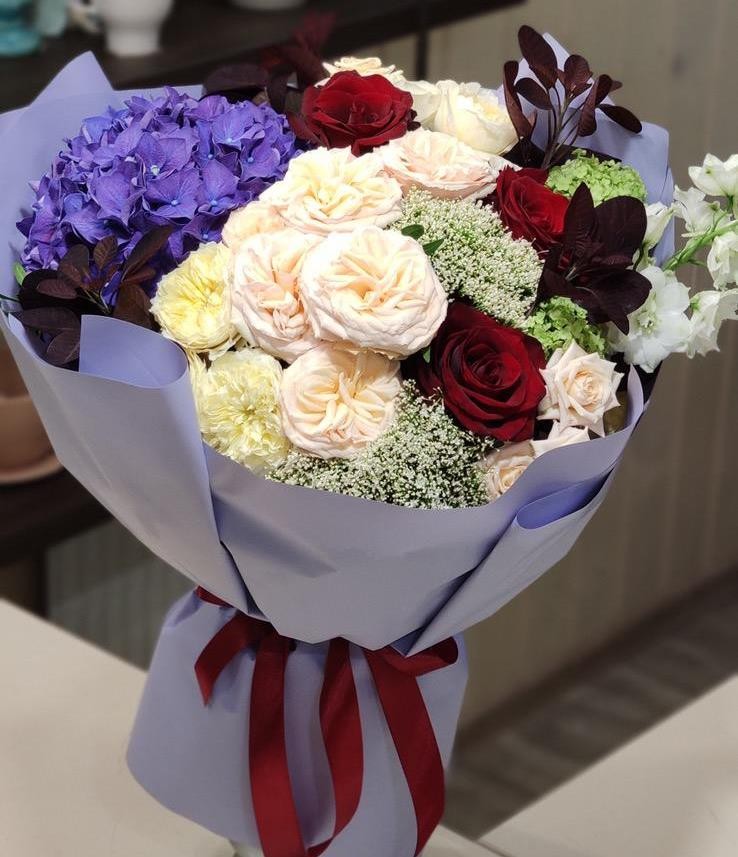 Букет мужской с гортензией, пионовидными розами, скумпией, трахелиумом и дельфиниумом