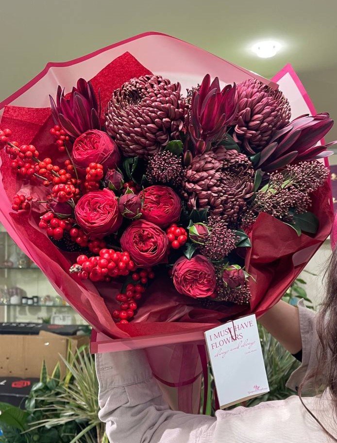 Букет (роза Ред пиано, хризантема Бигуди ред, илекс, скиммия)