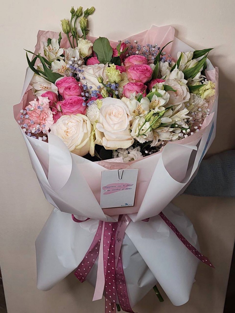 Букет с альстромерией, садовыми розами, гвоздиками, гипсофилой и эустомой
