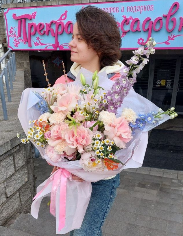 Букет с дельфиниумом, эустомой, танацетумом, гвоздиками, пионами,лилиями, глориозой, форзицией, французскими розами