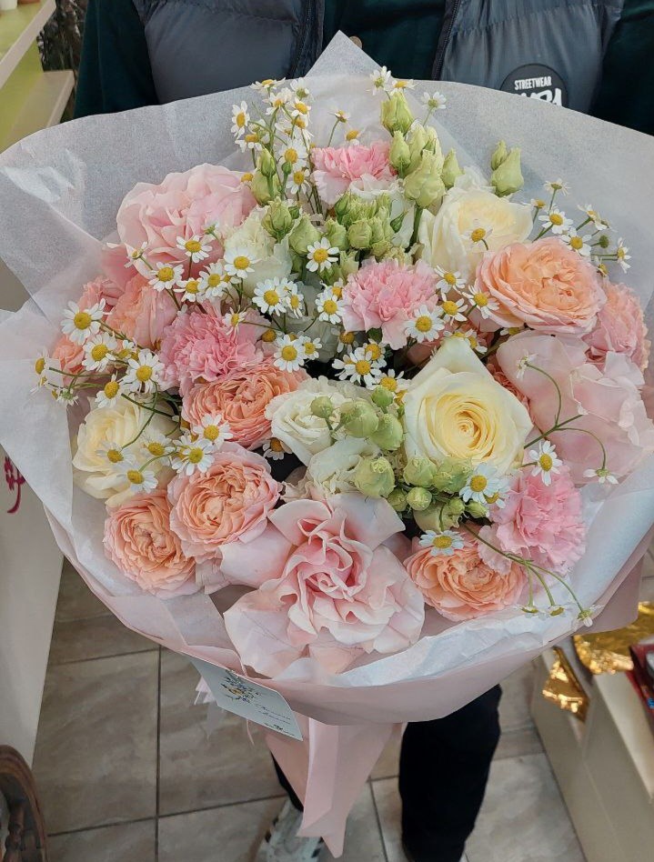 Букет с французскими и пионовидными розами, эустомой, гвоздиками и ромашками