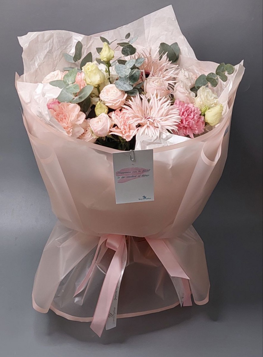 Букет с герберами, пионовидными розами, эустомой, гвоздиками, эвкалиптом