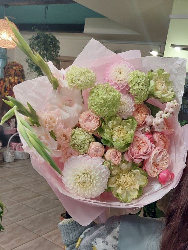 Букет с гладиолусами, георгинами, пионовидными розами Джульетта, Вегги, вибурнумом
