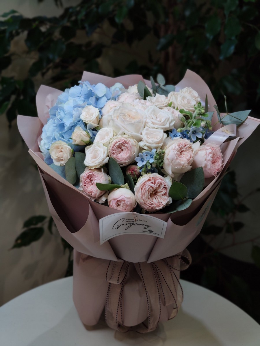 Букет с гортензией и пионовидными розами Менсфилд Парк