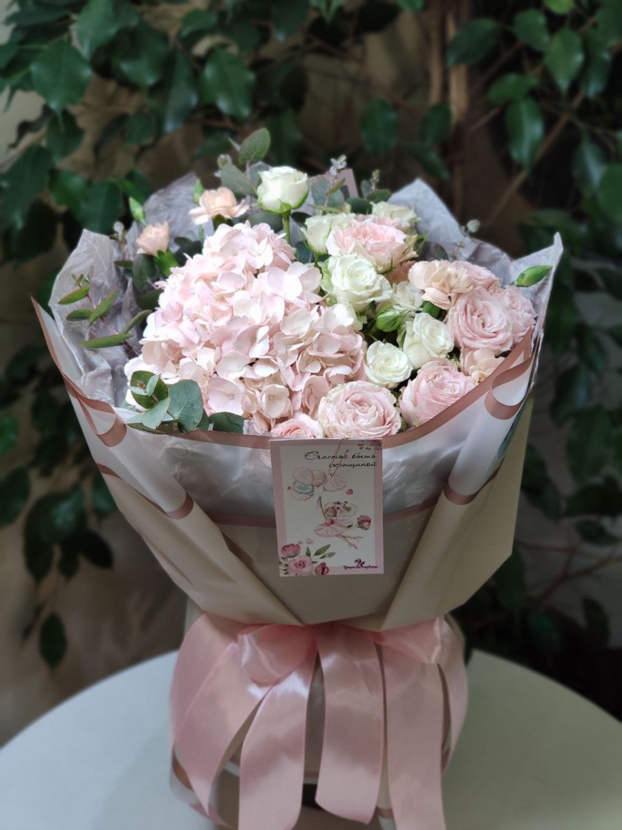Букет с гортензией, пионовидными розочками и эвкалиптом