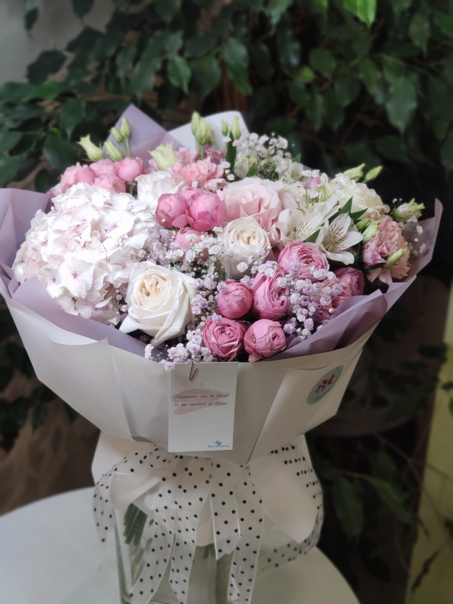 Букет с гортензией, пионовидными розочками Сильва Пинк и гипсофилой