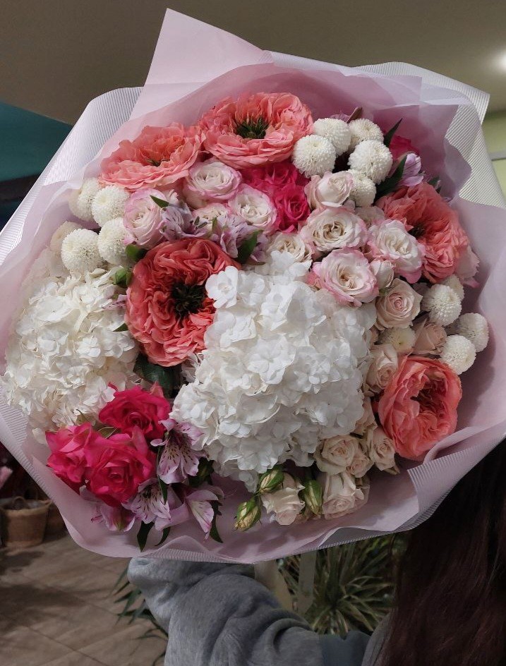 Букет с гортензией, розами Энджел бомбастик, розами кустовыми Парселина, хризантемами Ньютон, розами Мандарин, альстромерией