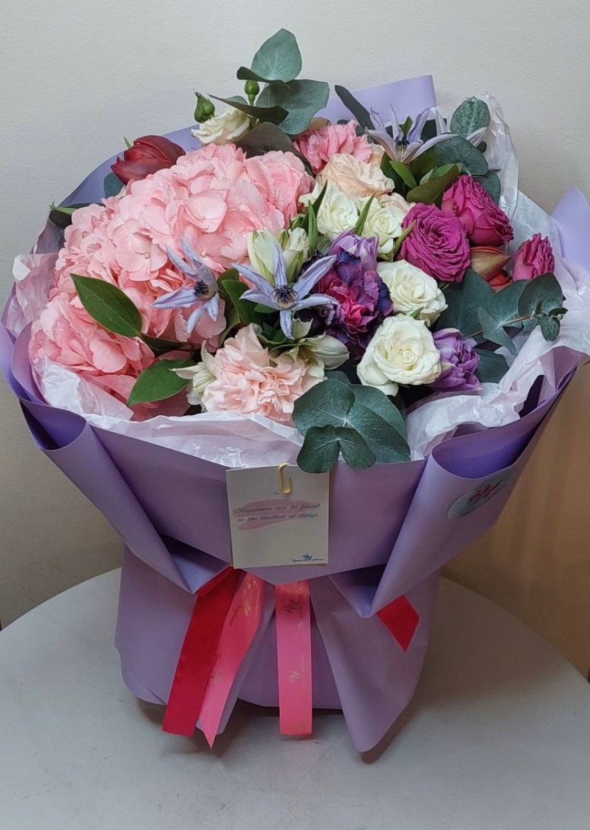 Букет с гортензией, розами различных сортов, гвоздиками и эвкалиптом