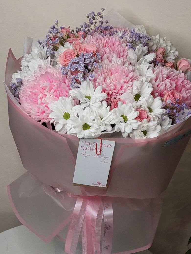 Букет с хризантемами Антонов Пинк Пастель, кустовыми хризантемами и розами, гипсофилой