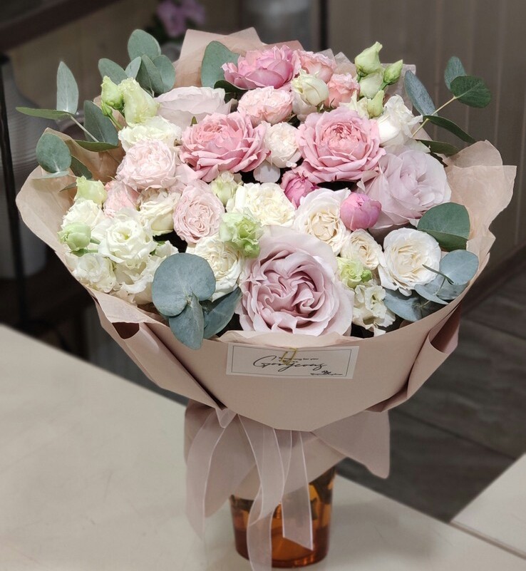 Букет с кустовыми и садовыми розами и эвкалиптом цинерея