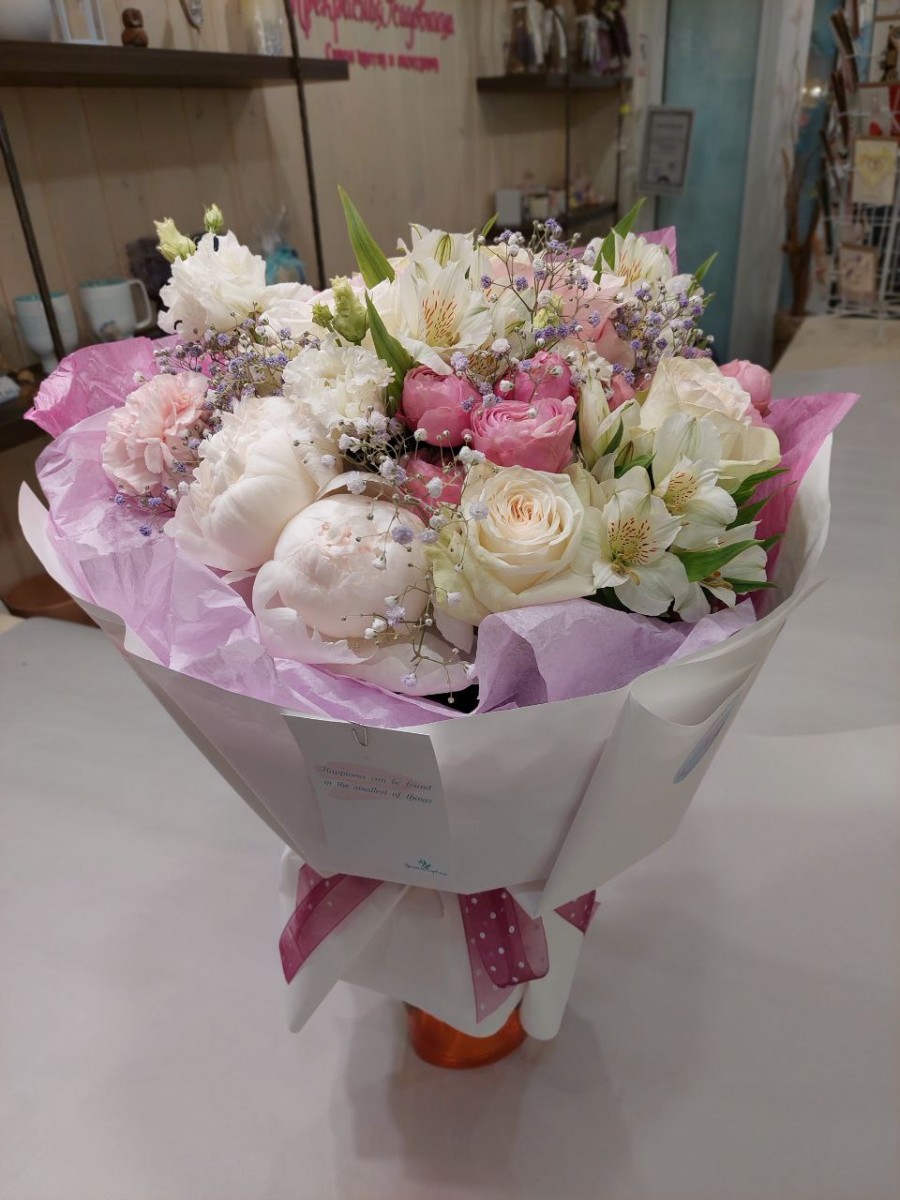 Букет с пионами, альстромерией, эустомой и кустовыми розами