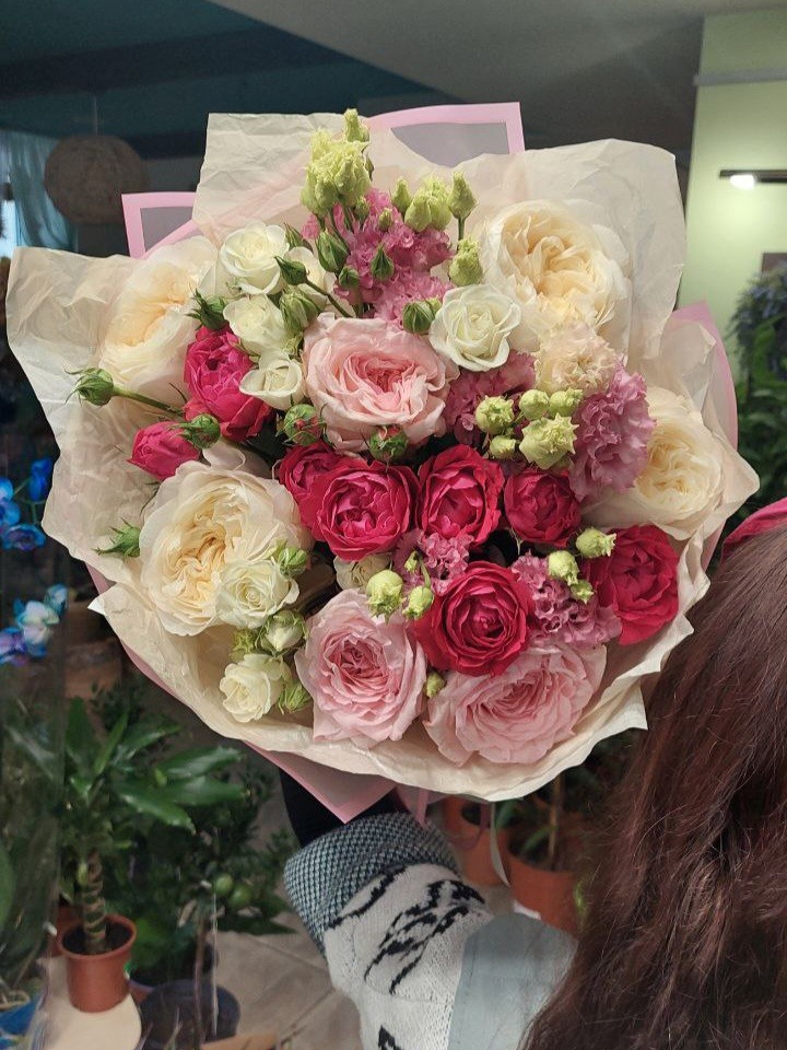 Букет с пионовидными розами Пинк Охара, Фатима, кустовыми розами, эустомой