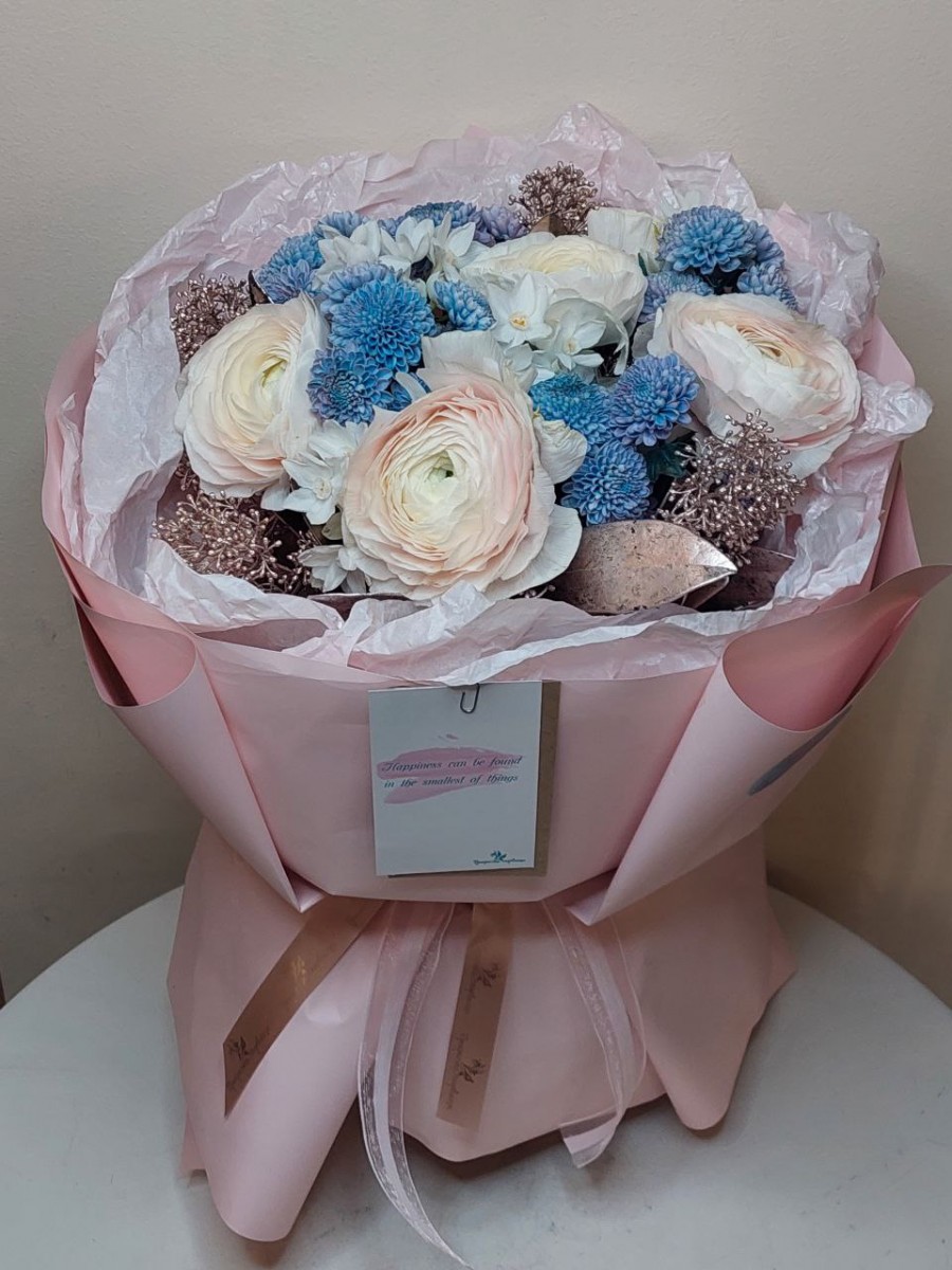 Букет с ранункулюсами, хризантемами, нарциссами и скиммией