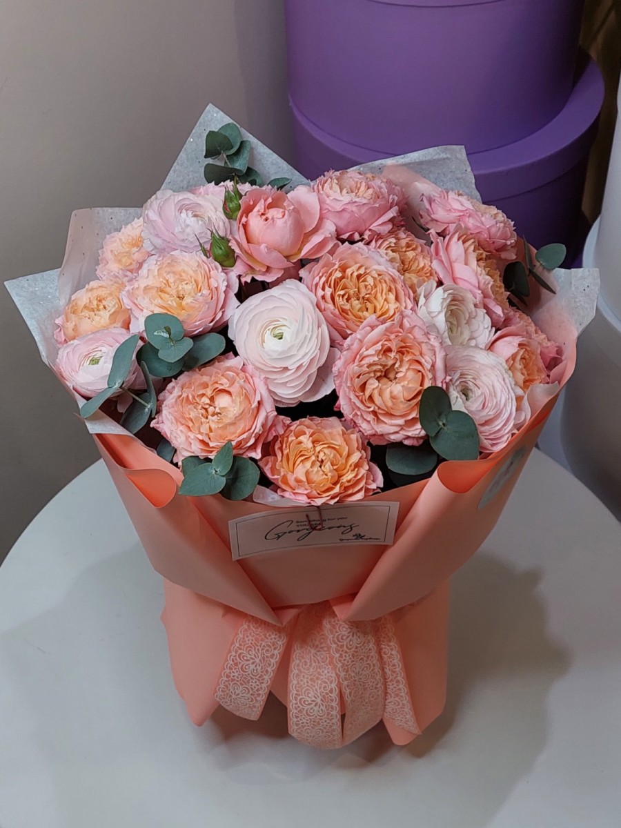 Букет с розами пионовидными Джульетта, ранункулюсами и эвкалиптом