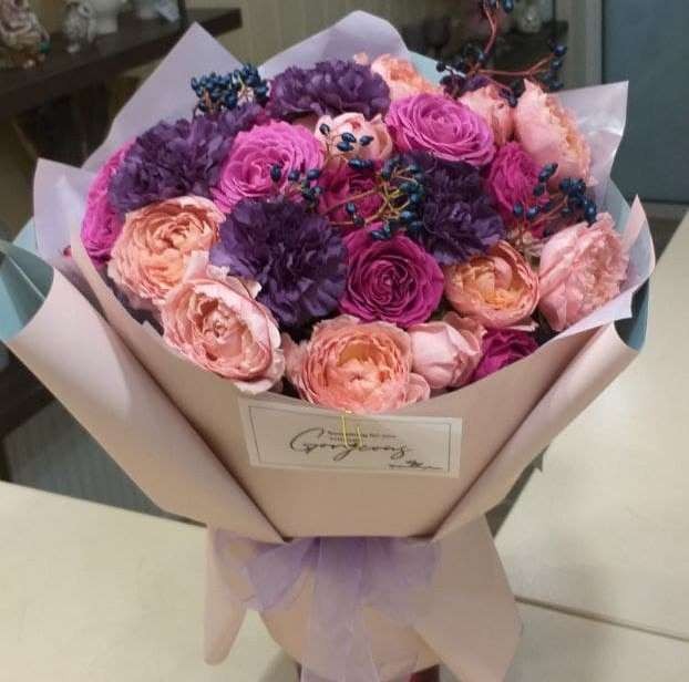 Букет с садовыми розами, пряной гвоздикой и ягодами вибурнума