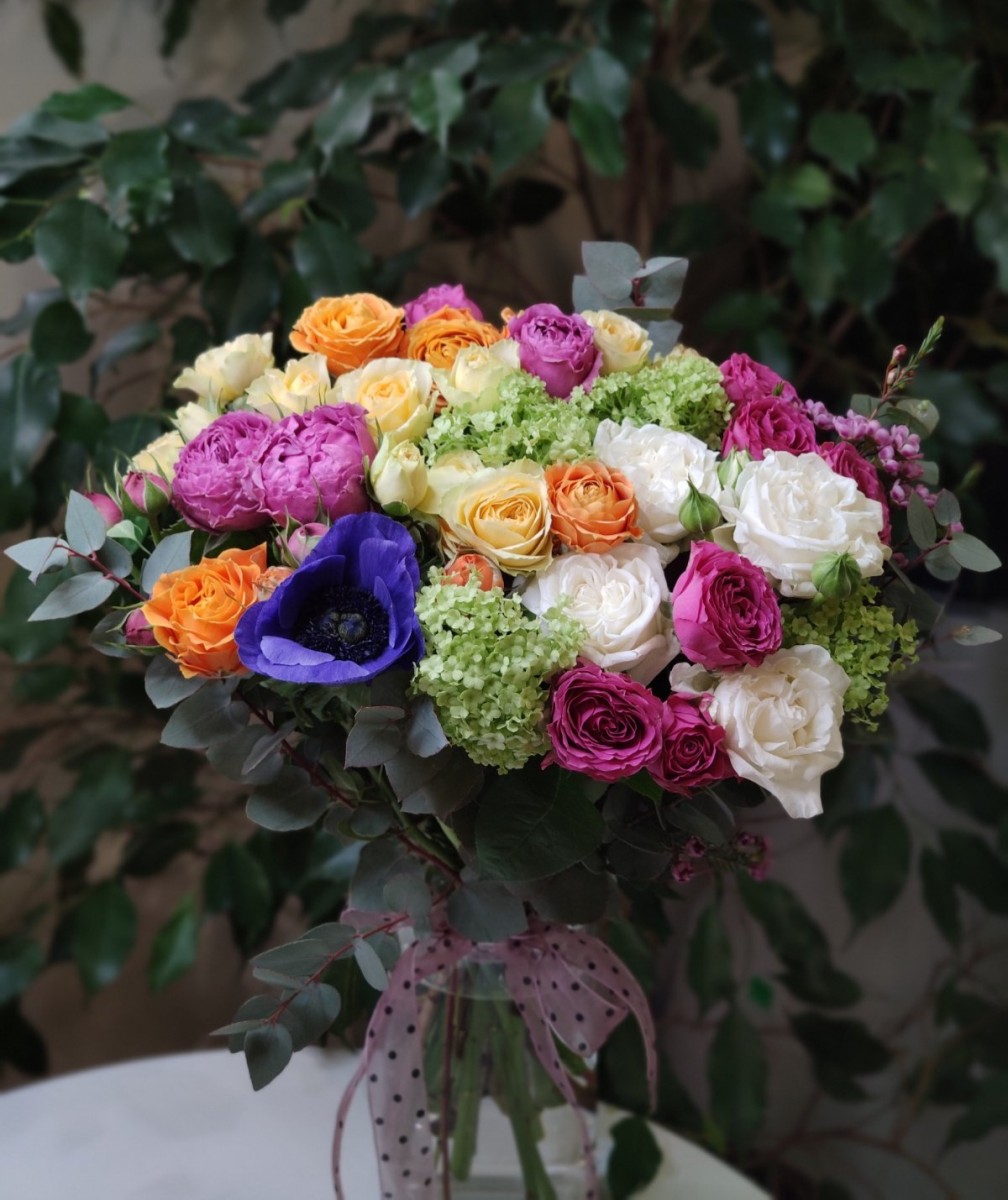 Букет с садовыми розами, вибурнумом, анемонами и эвкалиптом